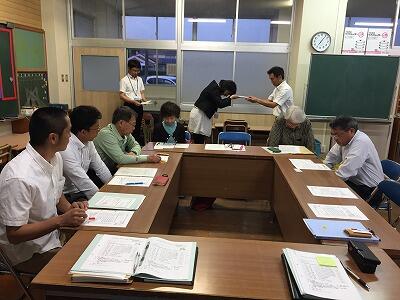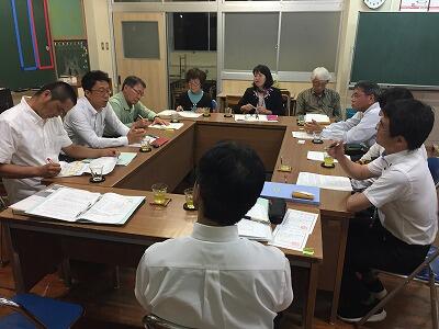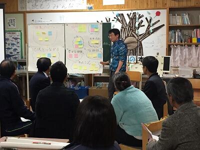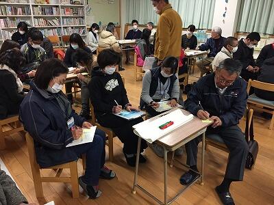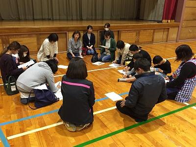 地域からは、区長さん、民生委員さん、スポーツ少年団指導者の方、読み聞かせの会の方、農業小学校校長先生、サーフィン連盟理事長さんなどなど、いろいろな立場の方々17名のご参加をいただき、保護者、教職員をあわせて総勢42名で、「財光寺で子どもたちがどう育ってほしいか」「地域・学校の”困りごと”とその解決に向けてのアイデア」をテーマに、それぞれの思いを”おしゃべり”することができました。