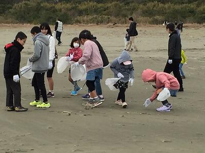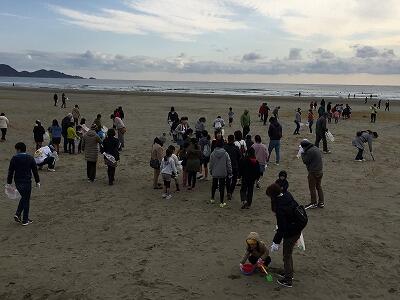 2月10日(日)、6年1組が「はまぐりプロジェクト」でお倉ヶ浜海水浴場の清掃活動を行いました。今回は、『渚を守る会』の方々とのコラボにより実現したもので、学級の子どもたちに加え、保護者の皆さん、事前の6年生の劇を見て参加してくれた下学年の子どもたちなど、本当にたくさんの方々にご協力いただきました。