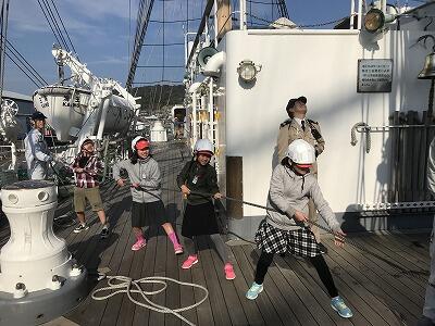 日本には帆船が4隻あります。新旧日本丸、新旧海王丸です。今回は、新海王丸での学習でした。船では、デッキ磨きやロープワーク、機関室でのエンジン操作等を体験させて頂きました。滅多にない機会であり、子ども達は、いつにも増してやる気満々で取り組めました。