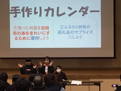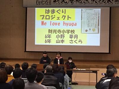 本校6年生女子2名は意見発表のトップバッターとして、これまでの取り組んできた『はまぐりプロジェクト』について、表情豊かに、上手に落ち着いて発表してくれました。さすがでした!このプレゼンに応えて、多くの方々が休憩時間に「本校6年作成オリジナル日めくりカレンダー」をご購入くださいました。ありがとうございました。中学生、高校生の発表や財光寺中学校吹奏楽部の演奏も聞くことができ、とても有意義な時間を過ごすことができました。