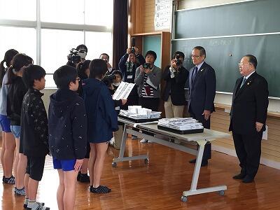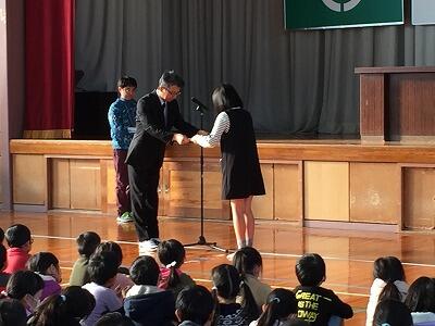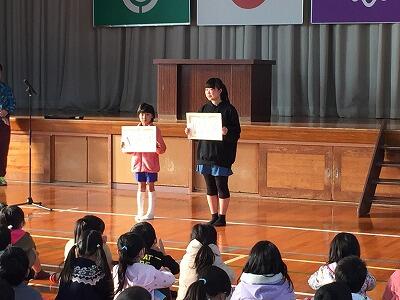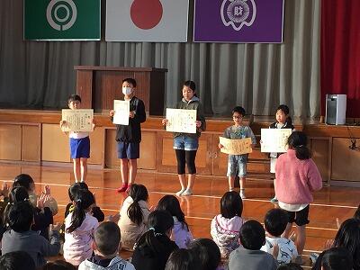 式終了後には、12月25日の「牧水かるた大会」で入賞した児童の表彰式が行われました。取った枚数を聞いた周りの児童から、驚きの声があがっていました。