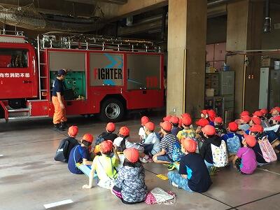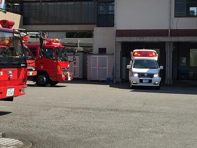 まず、車庫に並んだいろいろな種類のたくさんの消防車に、4年生の目は釘付けになりました。そして到着してすぐに救急車が出動。消防署の仕事を目の当たりにして、子どもたちの緊張感も高まっている様子です。