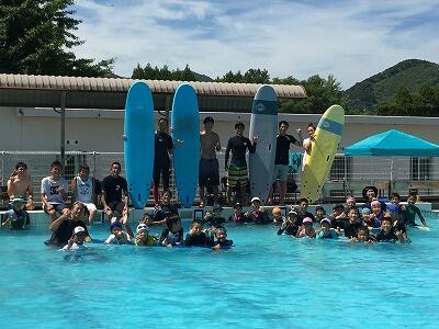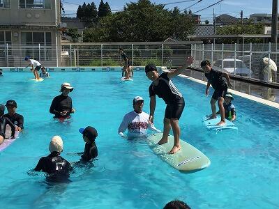 8月9日(木)、今年もサーフィン教室を開催しました。会場はお倉ヶ浜ビーチの予定でしたが、台風13号の影響で大きなうねりが押し寄せるクローズドコンディションのため、急遽、学校プールに変更しました。日向市サーフィン連盟13名の方々にご協力いただき、参加した23名の児童それぞれに、本当に丁寧に指導していただきました。チーム対抗パドリング競争も行われ、プールは大盛り上がり!参加した子どもたちは本当に楽しそうでした。閉会式では、サーフィン連盟の理事長さんに海の怖さについても教えていただきました。子どもたちは、サーフィンの楽しさ、海のすばらしさと怖さ、そして日向の海を大切にしている方々のすばらしさ、多くのことを学んだことと思います。大人になってもきっと覚えている、素敵な夏休みの1日になったことと思います!