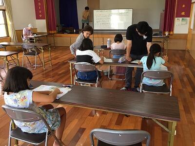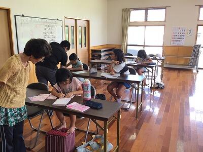 今年の夏休み、比良公民館では『子どもたち夏休み自主学習のひろば』という取組が、毎週月・水・金曜日、計13回展開されています。本日、子どもたちの様子を見に行くと、区長さんや区の役員さんに見守られながら、一生懸命に夏休みの課題や自分の勉強に取り組んでいる姿が見られました。元教師の地域の方や本校卒業のボランティアの大学生が、熱心に子どもたちの声をかけながら、学習のサポートをしてくださっていました。本当に、ありがたい取組です。いよいよ夏休みも残りわずか。来週は課題のラストスパートにやってくる子が増えるのではと、区長さんが楽しみにしていらっしゃいました。