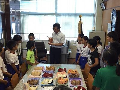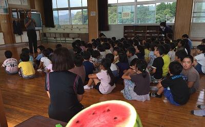 9月14日(金)、2年生は生活科(ふるさとの時間との関連)で「昔のおやつ・食べ物」についての学習を行いました。先生として、財光寺農業小学校校長で、本校の校長先生としてもお勤めになったことがある二見順雄先生をお招きして、お話を聞きました。昔のお話を聞きながら、子どもたちは「えーっ!」などと驚きの声を上げていました。農業小学校で作られたスイカも紹介していただきました。