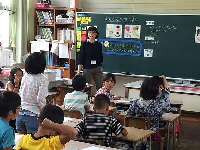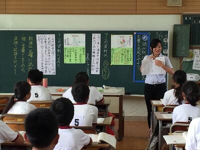 9月19日(水)3校時、初任者研修研究授業が行われました。今回は国語科で、「資料から情報を読み取り、読み取った情報をもとに文章を書く」ということがねらいの授業でした。運動会の全体練習後でしたが、5年3組の子どもたちは、先生の発問・指示に沿って「読む、書く」に集中して一生懸命に取り組んでいました。