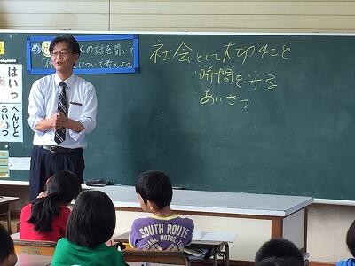 10月9日(火)2・3校時、3年生はマルイチの店長さんをお招きしてお話を聞きました。先週、マルイチ財光寺店に見学に行き、スーパーマーケットのいろいろな秘密を学びましたが、今回は、「仕事」や「働く」ということについて、店長さんから直接お聞きことができました。「働くというのは、地域にご恩しをするということ」「”時間を守ること””あいさつをすること”は大人になっても大事」など大切なことをたくさん教えていただきました。