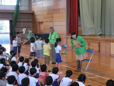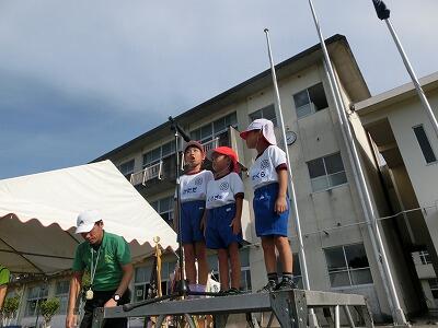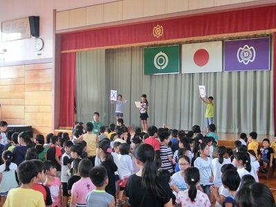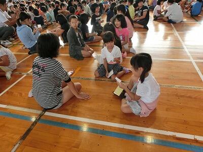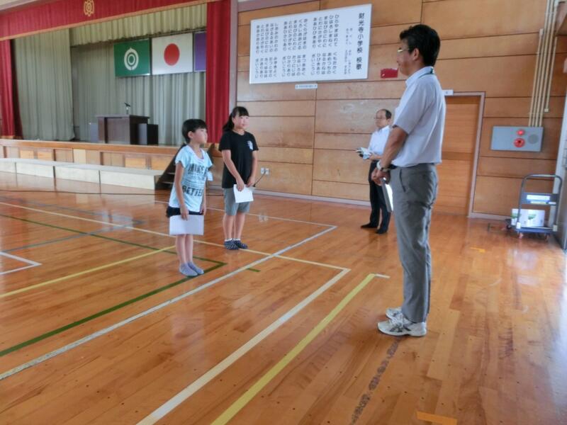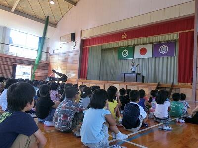 2つ目は終業式です。2年生と4年生2人の代表児童が意見発表を行いました。クラス替えをし新しい友だちとなかよくできたことやあいさつ・スリッパ並べをがんばったことなどを堂々と発表しました。1学期の学習や生活の様子については、通知表「あゆみ」にしっかりとまとめてありますので、夏休みの生活に役立てて欲しいと思います。