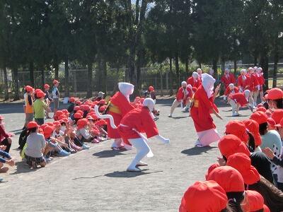 今年も、財光寺地区の厄年の男衆が、本校の運動場で、ひょっとこ踊りを披露して下さいました。本校の保護者も2名いて、子供たちは顔をほころばせながらの拍手喝采でした。