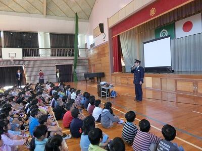平成13年に起こった大阪・池田小での小学生無差別殺傷事件のことや日向市内における声かけ事案の状況、知らない人に声をかけられた時の対応など分かりやすくお話をしていただきました。