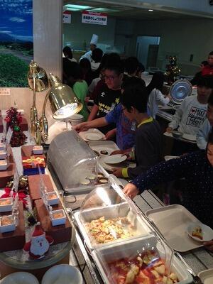 ホテルでバイキング料理をいただきます。おいしそうな料理が並んでいます。