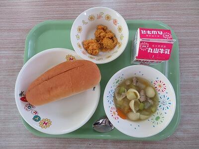 今日は、奈良県の郷土料理である「吉野汁」がでました。吉野汁は野菜たっぷりのすまし汁にくず粉をといてとろみをつけた汁です。くず粉の産地が奈良県の吉野であることからこの名前がつけられました。現在、くず粉は貴重品になり、今日はくず粉の代わりに片栗粉が使ってあります。あんかけのように口当たりがよく、冷めにくいので寒い時に体が温まります。