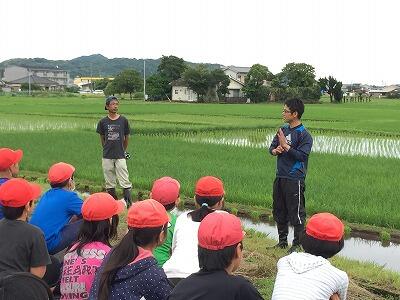 5月30日(水)1~3校時、絶好の(!?)田植え日和。本年度も治田さんのご協力により、お米プロジェクトをスタートさせることができました。最初に治田さんから米づくりの一連の作業や苗の受け方についてのお話を聞いた後、田植えスタート。
