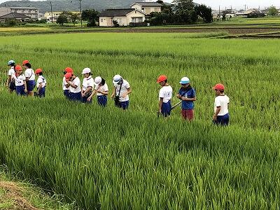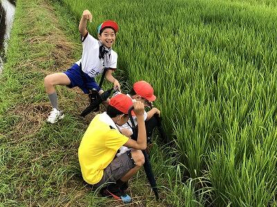 田植えをして1か月半、稲がどれぐらい生長しているのか、本日田んぼの観察をしてきました。10cmほどだった苗が3倍ほどの高さになり、子どもたちは驚きの様子を見せていました。また、稲の生長だけでなく、稲のまわりに生息するタニシやかえるにも興味をもち、観察していました。その後、田んぼのまわりの草抜きをしました。一生懸命行って、とてもすっきりしました。