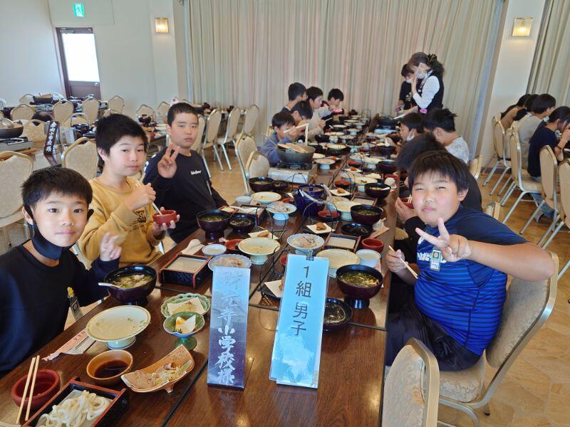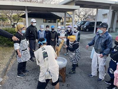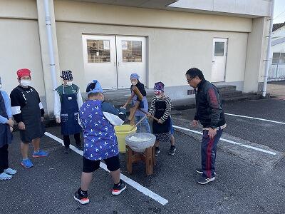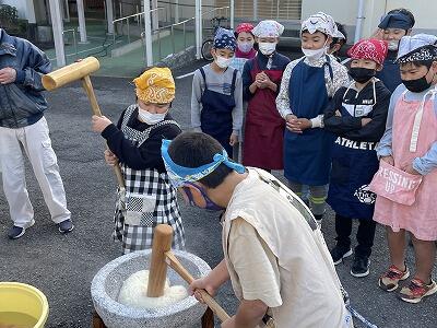 5年生が田んぼで育ててきたもち米の収穫が終わり、今日はそのもち米を使ったもちつきでした。