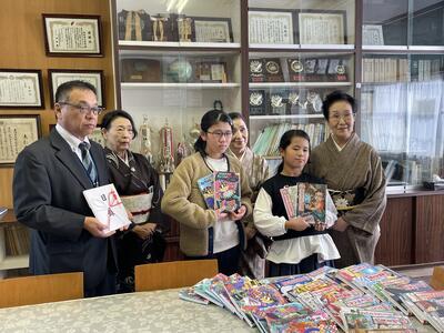 12月21日、日向市舞踊連盟の3名の方々が校長室におみえになり、本の目録を贈呈していただきました。