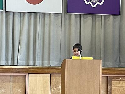 児童を代表して、図書委員会の委員長がたくさんの本に触れることができる喜びをお礼として述べました。