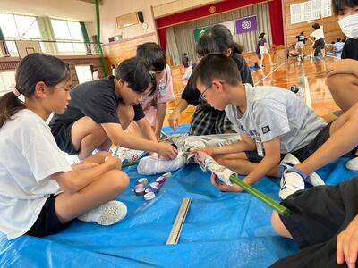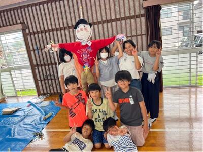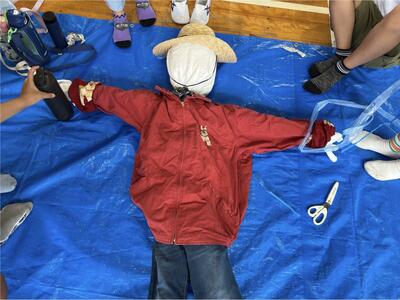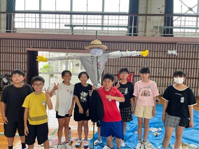 総合の学習で、お米作りをしている5年生ですが、今日は田んぼを守るために、体育館でかかし作りを行いました。