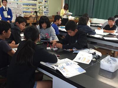 11月7日(木)5校時、日向市教育研究所の先生方が取り組んでいるプログラミング教育の研究授業が6年1組で行われました。「発電と電気の利用」の単元の中で、電気を効率的に使うためのプログラミングの仕方について6年生がグループごとに協力して考えました。タブレットPCと実験器具をつなぎ、自分たちで考えたプログラム構成を試しながら、明かりの付き具合を確かめる子どもたち、意欲的に熱心に取り組んでいる姿が印象的でした。
