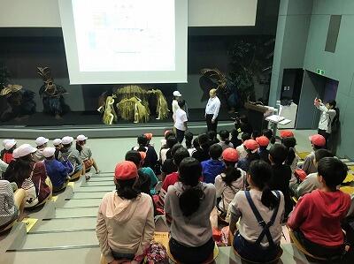 11月5日(月)昼休み時間、2日(金)3日(土)に行われた五十猛神社大祭でひょっとこ踊りを奉納された翔馬縁会の方々が来校され、子どもたちの前でひょっとこ踊りを披露してくださいました。おなじみの鐘、笛、太鼓の音に乗って、子どもたちの間近で踊っていただき、大盛り上がりでした。地域に伝わる文化芸能に毎年触れられる財光寺小学校の子どもたちは、本当に幸せだと思います。