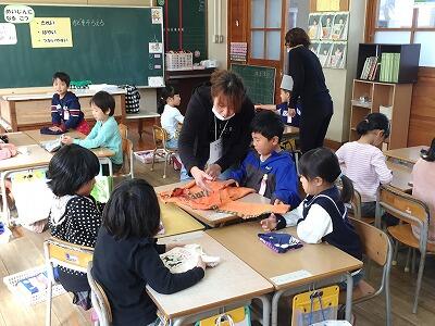 11月1日(木)2・3校時、1年生は生活科「ひろがれ、えがお」の学習で、せんたくものたたみに挑戦しました。1組2組3組にそれぞれ、せんたくものたたみ名人のお父さん、お母さんにゲストティーチャーとして入っていただき、名人の技を披露していただいたり、たたみ方のコツを教えていただいたりしました。皆さん、教え方が大変お上手で、1年生は、あっという間にきれいにたためるようになりました。おうちでもいっぱいお手伝いして、せんたくものたたみ名人をきわめてほしいと思います。
