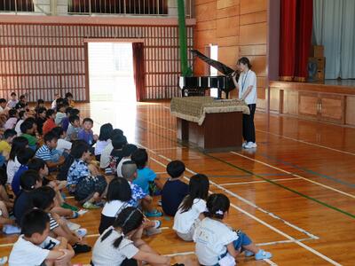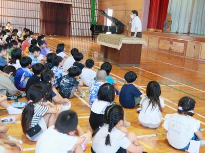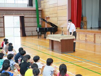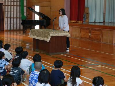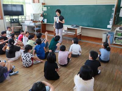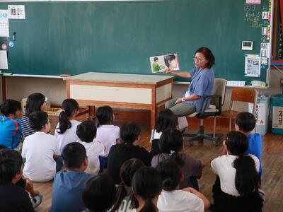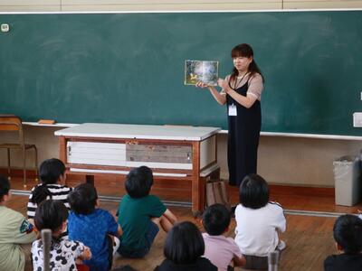 本校で絵本の読み聞かせをしていただいている「どんぐりの会」の皆さん。1学期も学年問わず、読み聞かせで楽しませていただきました。日向市は現在、新しい図書館の建設に向けて市民ラボが開催されています。また、宮崎県も読書県を掲げて取り組んでいます。絵本から伝わる物語の面白さ、深さ、そして読み手の表現力で、絵本の世界観に子どもたちは引き込まれます。