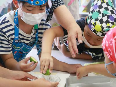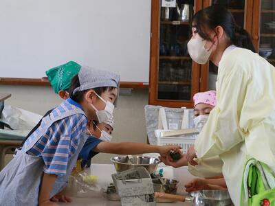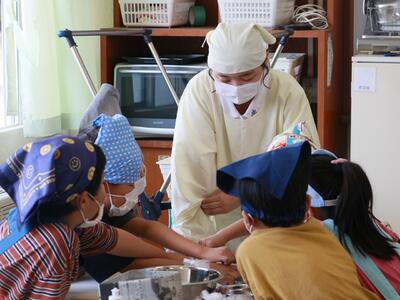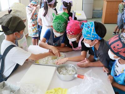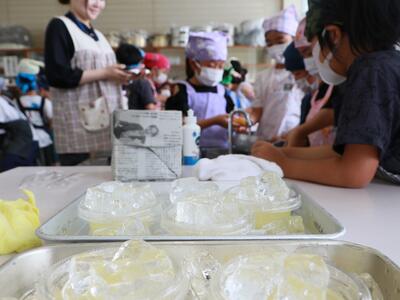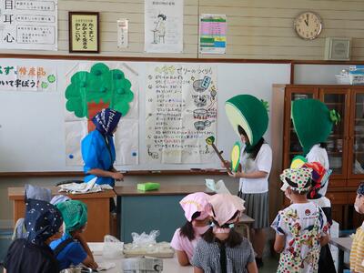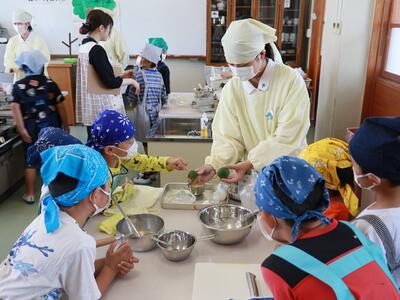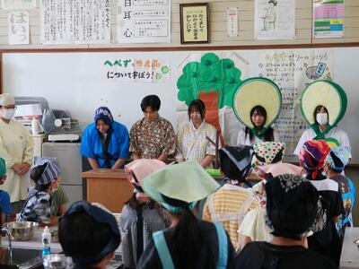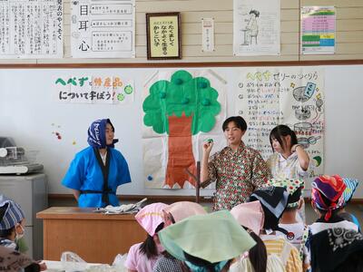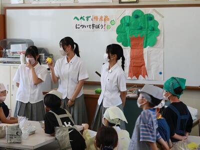 富島高校から先生と生徒の皆さん10名が来校し、2年生と「へべずゼリー」つくりを体験しました。子どもたちは、へべずとかぼすを比べたり、高校生の作り方やなぜへべずと言われるようになったかなどの話を聞きながら、楽しくゼリーづくりを体験しました。高校生ともおしゃべりを楽しみながら、にぎやかな時間になりました。出来上がったゼリーは、へべずの香りがとてもよく、美味しくいただきました。