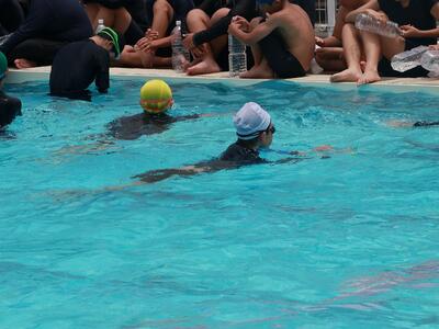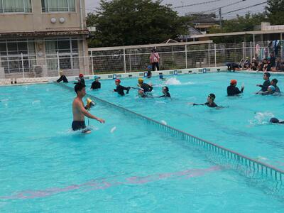 今年度の水泳学習の納会で、6年生が着衣泳を実施しました。洋服を着たまま水の中に入る体験やペットボトルを使って非常時における対応などを体感しました。夏休みの期間中、ルールを守り、安全に水に親しむ時間を楽しんでほしいと思います。