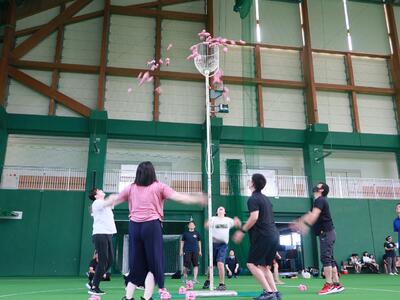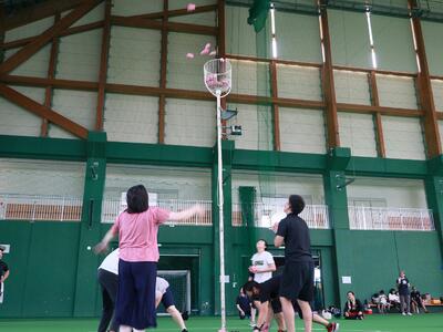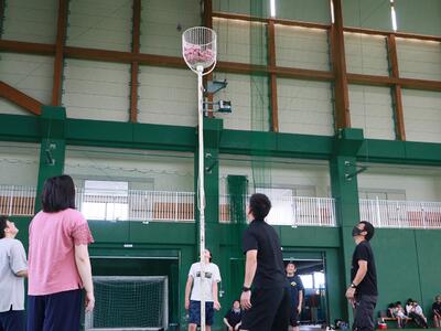 台風の影響が心配されましたが、35度近い気温の中、サンドーム日向で日向市PTA連絡協議会主催の市内各学校親睦!の玉入れ大会がありました。本校からは保体部の方々と下田先生が入り、チームを組みました。昨年度までは、8月後半に行われていましたが、今年は7月に開催。子どもたちの行事も重なる時期でしたが、各学校の精鋭が声を掛け合い、楽しそうに取り組んでいました。市PTA保体部の方々の運営でスムーズに進行も進み、終わるころには汗だくになりながらも親睦を深めていました。本校は残念ながら予選で敗退しましたが、99個のおじゃみが入り、最後100個めの黒のおじゃみが収まると、自然と笑顔にあふれていました。他の対戦では審判も務めていただきました。寺田保体部長は、朝7時に学校に来られ、大型扇風機の運搬をしたり、開閉会式の進行をされるなど大忙しでした。お疲れ様でした。