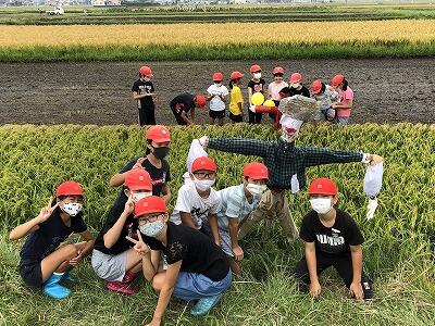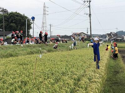 昨日、5年生が1校時から4校時にかけて、稲刈りをしました。6月の田植えから4ヶ月、稲は立派に育ち、たくさんの実をつけていました。これまで、田んぼの管理や草刈りなど、地域の方々にも協力していただきました。心より感謝しています。子どもたちは、鎌をもって一束一束ていねいに刈り取り、2人組で縛るところまで上手にできました。縛った稲は、かけ干しし、本日の作業は終了しました。次は、10月30日(月)の脱穀です。この米作りの貴重な体験を通して、農家の苦労や食の大切さ等、学ぶことができればと思っています。