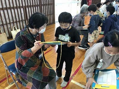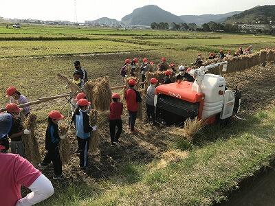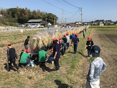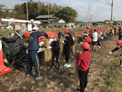5年生は、10月30日(金)に脱穀をしました。実習田に到着したら、まず地域の方に脱穀の仕方や手順を教わりました。そして、さっそく作業に取りかかり、みんなで協力して脱穀の作業をしました。干してある稲を運ぶ児童、稲を干すための竹等を運ぶ児童、落ちた稲を一本一本拾う児童などなど、それぞれの活動に一生懸命取り組みました。結果、7袋のもみつきのお米ができました。児童は、もみつきの米の匂いをかいだり、一袋の米を持って重さを実感したりと、貴重な体験をしました。次は、いよいよ精米となります。できあがった米を見るのが楽しみです。