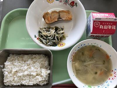 魚のもみじ焼 そえ野菜 みそ汁 麦ごはん 牛乳
