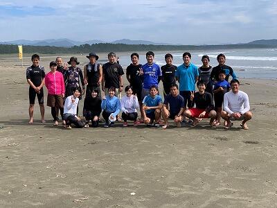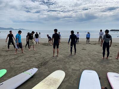 キャリア教育研修として、1つのグループは日向市サーフィン連盟の方々のご指導の下、お倉ヶ浜ビーチで「サーフィン体験」に挑戦しました。