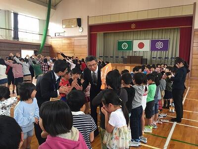 本日、10名の先生方が財光寺小学校とお別れされます。離任式では、それぞれの先生方から心のこもったごあいさつをいただき、児童代表の5年生の言葉で、先生方の目にも涙が・・・。最後は、全校児童の”財道”(たからみち)でお見送りをしました。