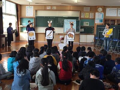 1月29日(火)、東郷病院の栄養士さん、看護師さんをお招きして、4年生で食育授業を行いました。「よい”うんち”を作るひみつを知ろう!」のめあてのもと、寸劇形式で野菜の繊維質の大切さや甘い物の食べ過ぎへの注意などをわかりやすく教えて下さいました。4年生児童も、興味深く劇を見ながら、学んでいる姿が見られました。