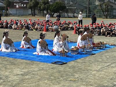 11月2日(火)、本校にて地域の「酉戌炎舞会(ゆうじゅつえんぶかい)」によるひょっとこ奉納と、小中学生を中心とした浦安の舞、獅子舞が行われました。ご存知の通り、五十猛神社秋季例大祭に伴い60年以上続く伝統行事です。