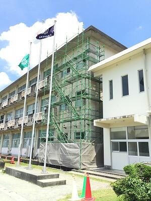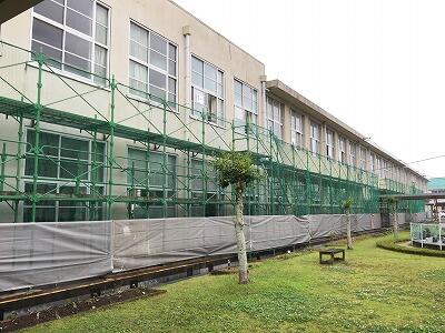 南校舎中央1F~3Fトイレ(職員・5年・6年)と北校舎1F南側土間(西側:1の3~東側:児童クラブB)までの間に足場が設置されます。1・2年の教室は南側の教室出入り口から外に出ることはできません。