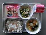 今日の献立は、ちらし寿司、牛乳、えび団子のすまし汁、菜の花和え、ひなあられでした。