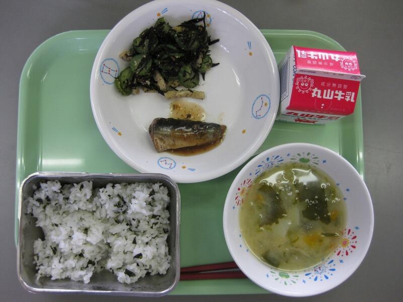 ○わかめご飯 ○牛乳 ○いわし梅煮 ○ひじきの和え物 ○味噌汁