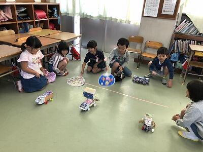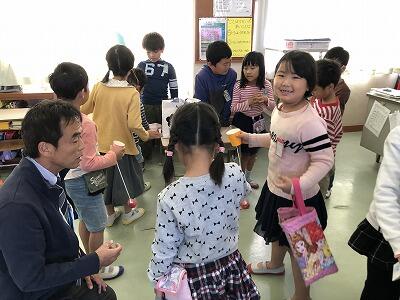 2年生は、友達と協力してボーリングやけん玉、魚釣りやトントンすもう、空気砲などのエコおもちゃを作成し、1年生をもてなしました。