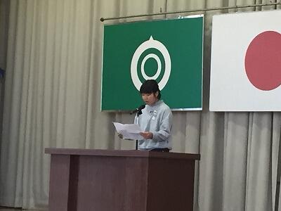 その後、表彰を行いました。まずは「青の國若山牧水短歌大会」で佳作に選ばれた1年生2名が、自分の作った短歌を堂々と朗詠してくれました。すばらしかったです。