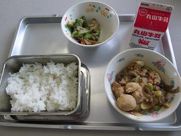 今日の給食は、ご飯、牛乳、里芋のそぼろ煮、アスパラのごま和えでした。