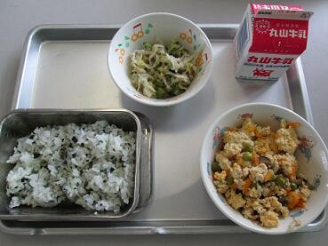 今日の給食は、わかめご飯、牛乳、炒り豆腐、千切り大根のサラダでした。