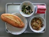 今日の献立は、マヨネーズパン、牛乳、ソース炒め、新たまねぎのサラダでした。