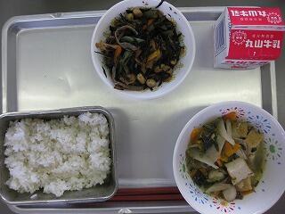 たけのこの旬は春です。農家の方が、採ったばかりのたけのこを湯がいて給食センターまで届けてくれます。たけのこは、10日ほどで硬い竹になってしまうので、土から次々に頭を出すたけのこをとるのは大変です。また、湯がいたたけのこは温度管理が大変で、水につけておかないと一晩で腐ってしまいます。手間暇かけておいしくしてくださる農家の方に感謝し、たけのこの歯ごたえと香りを楽しんで食べましょう。ごちそうさまでした。