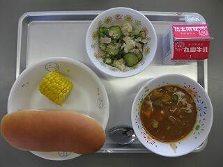 ○減量チーズパン ○牛乳 ○ビーフシチュー ○カリフラワーの和え物 ○ゆでとうもろこし