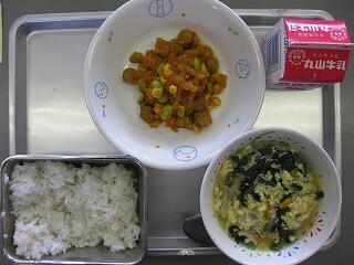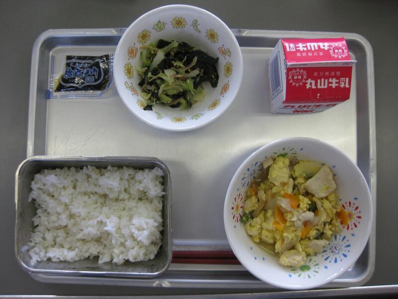 ○麦ごはん 一食のり ○牛乳 ○高野豆腐の卵とじ ○じゃこ和え