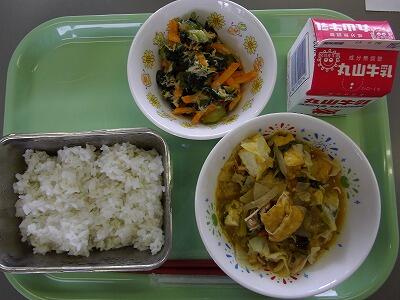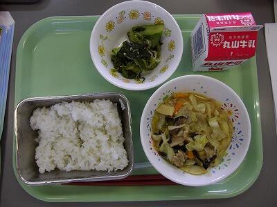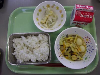 毎日の給食の時間は、いつも給食当番が配膳を行っています。給食当番のつぎ方を見てみると、家で手伝いをしている人は、上手にできているようです。自分からお皿やコップを並べたり、自分から進んでしてほしいですね。今日は中華風のメニューでとてもおいしかったです。ごちそうさまでした。