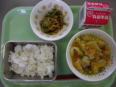 今日の和え物は、ちりめんを使った酢の物でした。宮崎県の日向灘沖合いでとれたものだそうです。水揚げされたちりめんは、持ち帰って釜でゆでられ、お日様に干して乾燥されます。宮崎には、こうした新鮮でおいしい食べ物がたくさんあるので、給食でも使用されています。