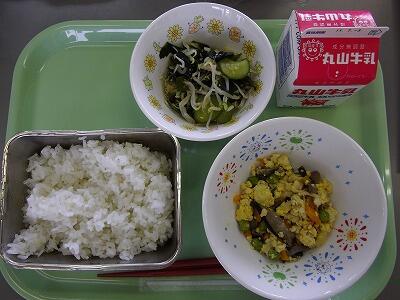 *今日の献立* 麦ごはん、牛乳、炒り豆腐、ちりめんの酢の物